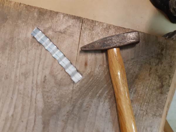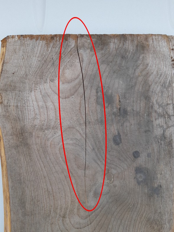 Vorsicht Risse! Frisches Holz ist naß. Es trocknet und bei diesem Trockenvorgang bewegt sich das Holz und es kann dazu kommen, dass das Brett einreißt. Je schneller der Trockenvorgang, desto höher die Gefahr von Rissen und Verzug. Um solche Risse zu verhindern oder deren weitere Ausbreitung zu unterbinden, kann zusätzlich Wellenband eingeschlagen werden. Dazu einfach ein kurzes Stück des Wellbandes mit einem Bolzenschneider oder der Flex abscheiden und in etwa gleichmäßig, den Riß überlappend, von der Stirnseite ins Brett einschlagen. Kleinere Risse werden bei der Bearbeitung aber in der Regel ohnehin weggeschnitten. Deswegen soll das Brett ja einige Zentimeter länger gekauft werden.