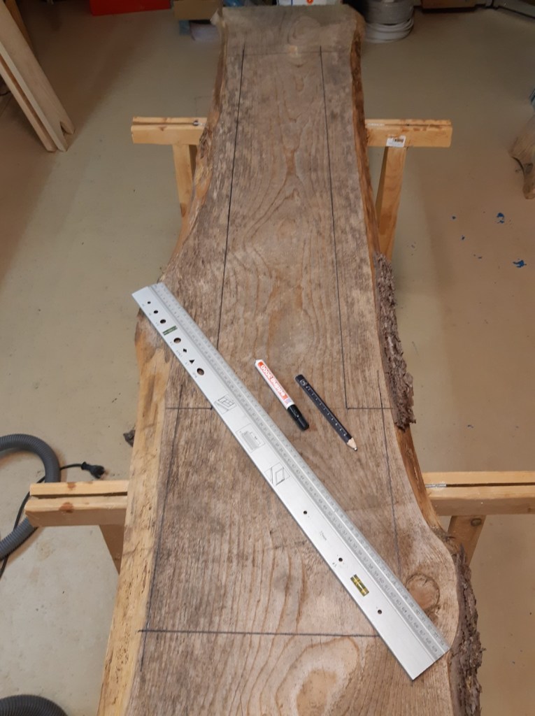 Anschließend kann die Skizze auf die Bretter übertragen werden. Zum Markieren der Schnittlinien eignen sich Bleistift oder auch ein Eding. Um die Linien gerade und im rechten Winkel hinzubekommen am besten ein längeres Lineal und einen Winkel verwenden. Wenn das nicht zur Hand ist, tut es auch Meterstab. Mit ihm können sowohl die Linien gezogen werden und die Ausrichtung über die Messung der Diagonalen vorgenommen werden.
